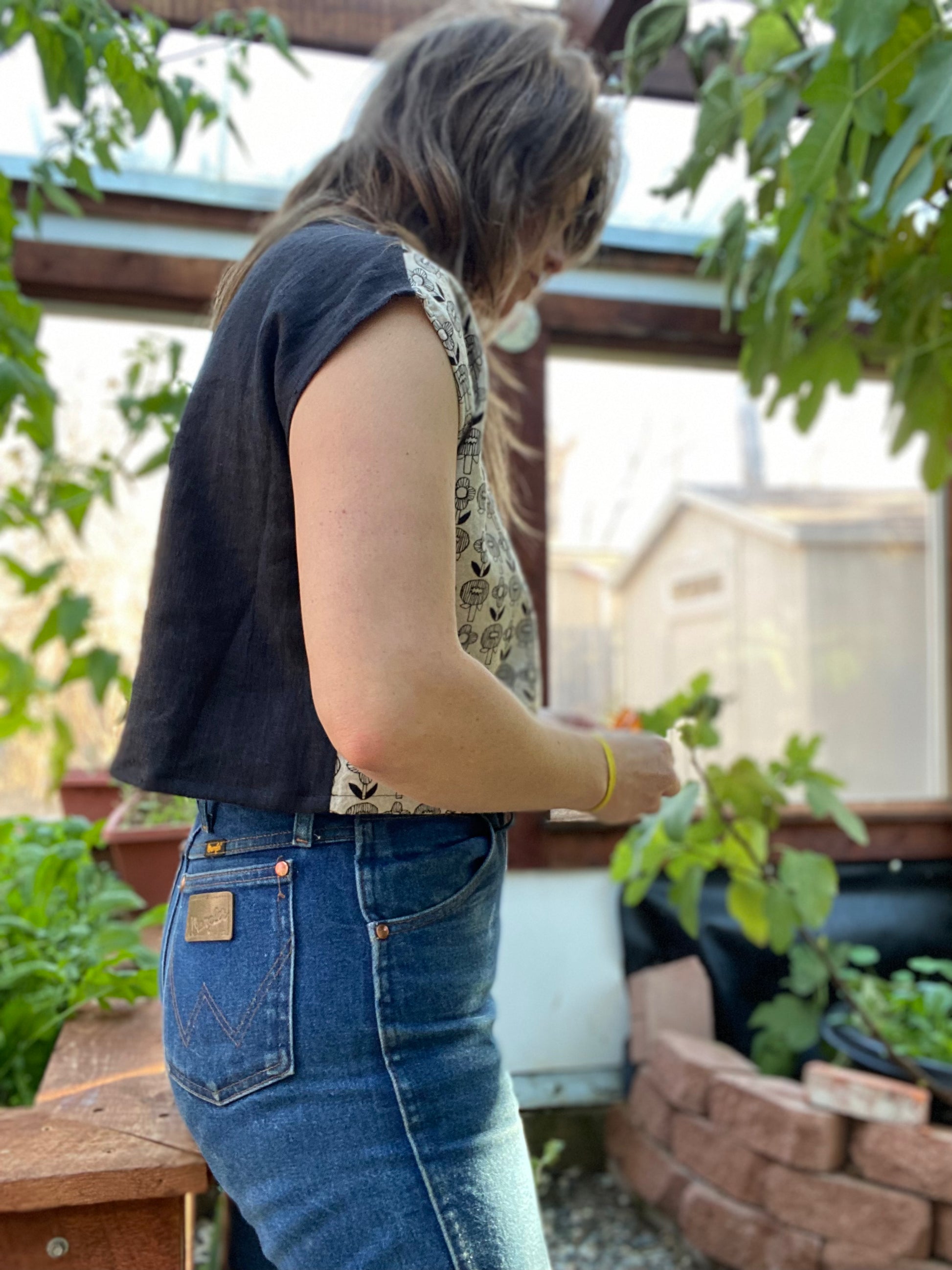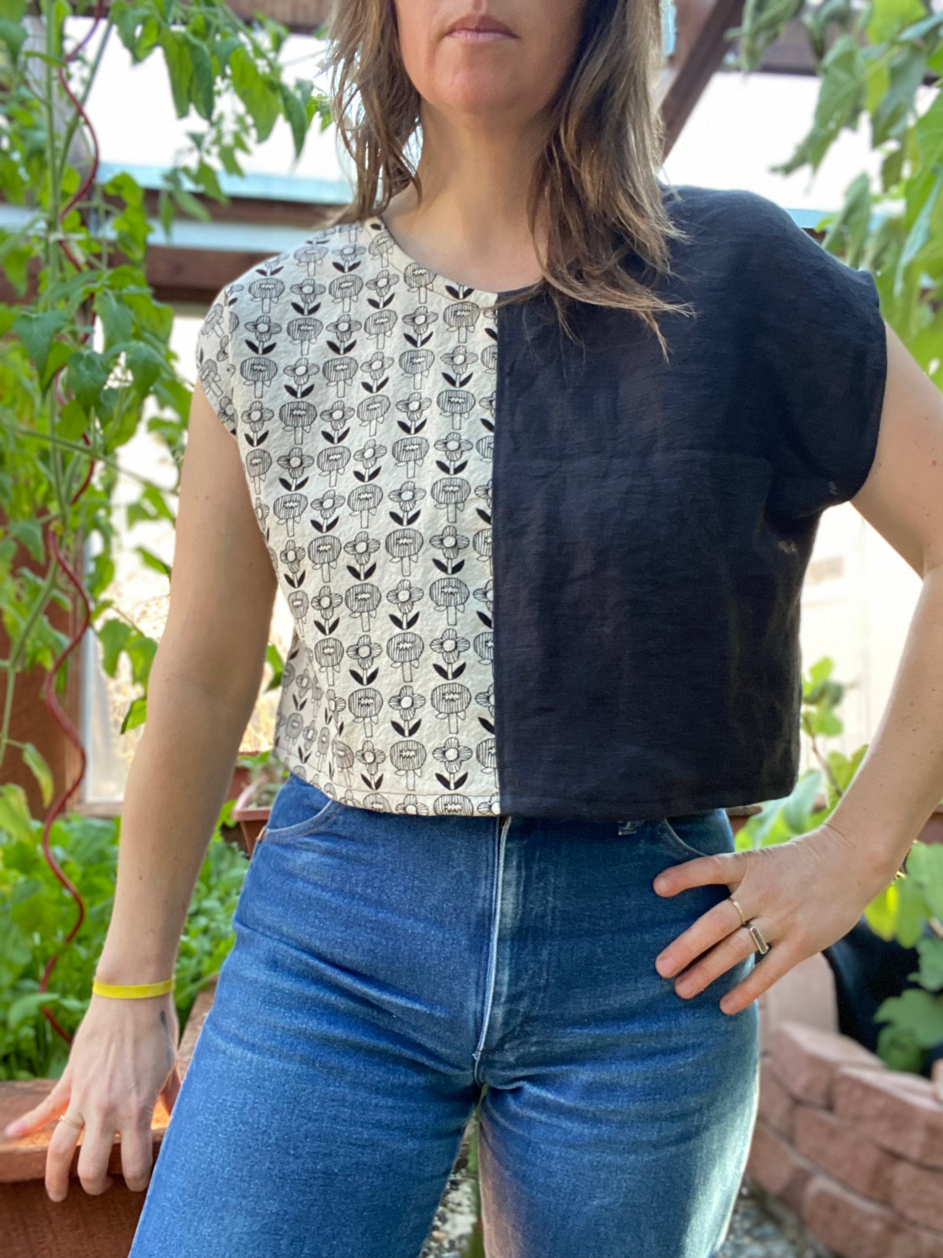 75% 7oz Linen, 25% lightweight cotton canvas cropped Box Top. *when I mix two different fabrics I want the drape to be exact or near so that there’s no awkward fit.