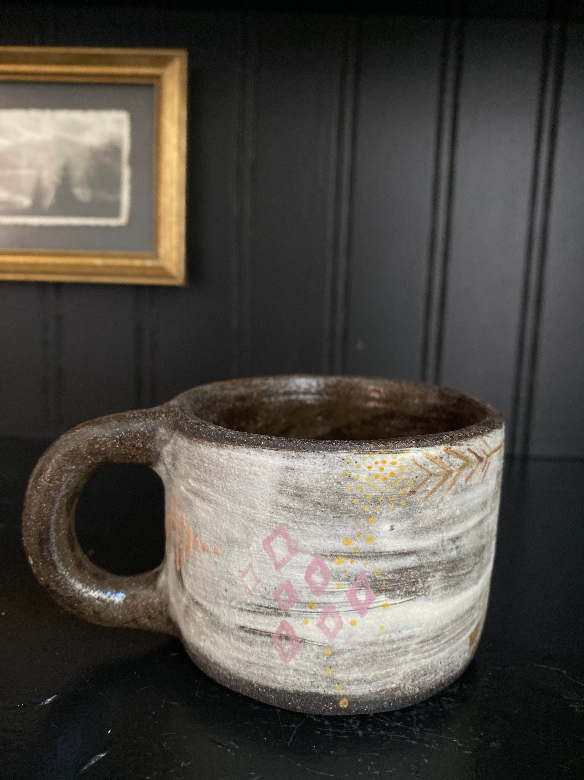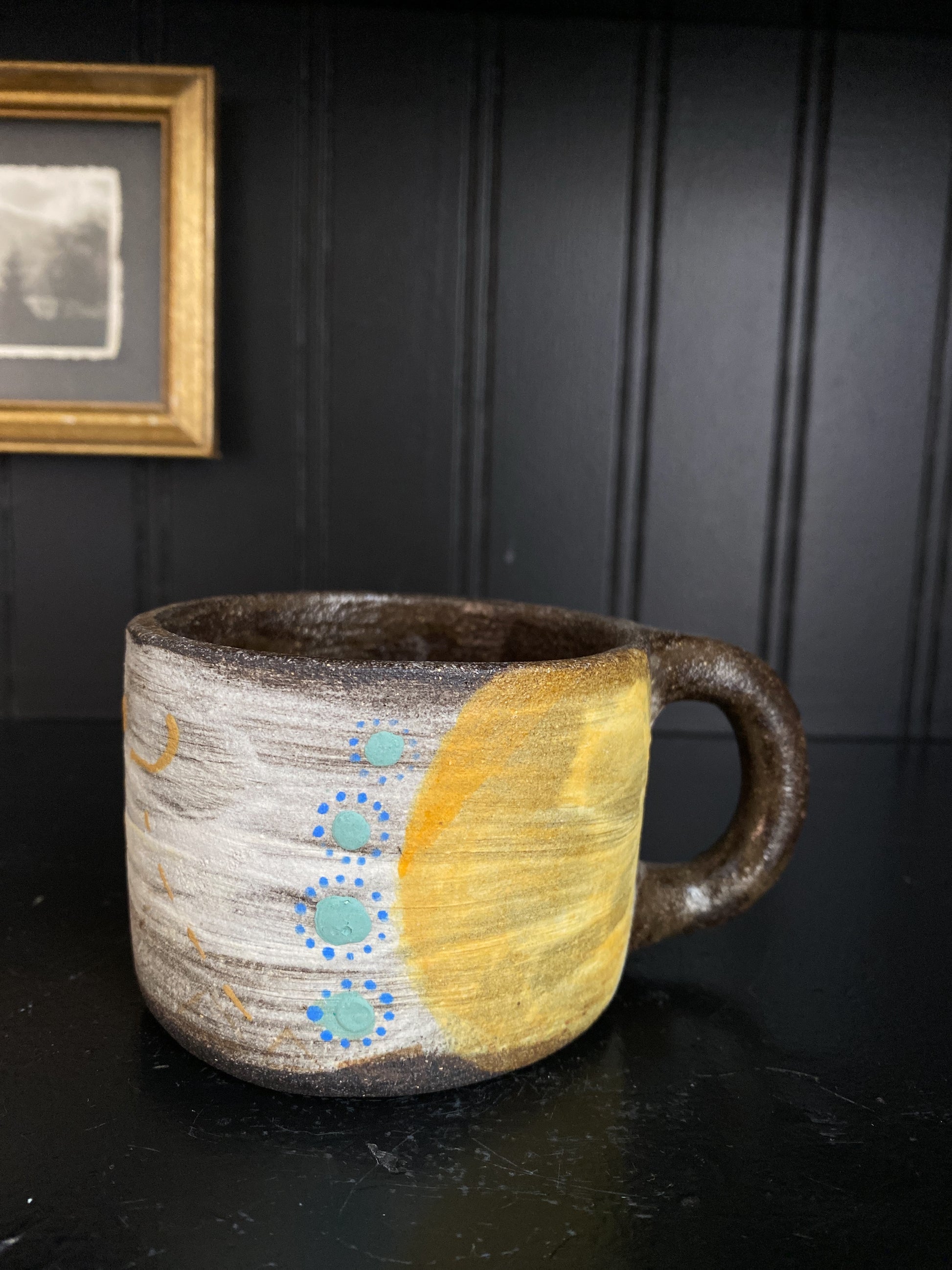 Hand Built 6oz ceramic mug. Food, Dishwasher and microwave safe. Intermixed raw clay body with underglazes/glazed exterior and a clear glaze interior.
