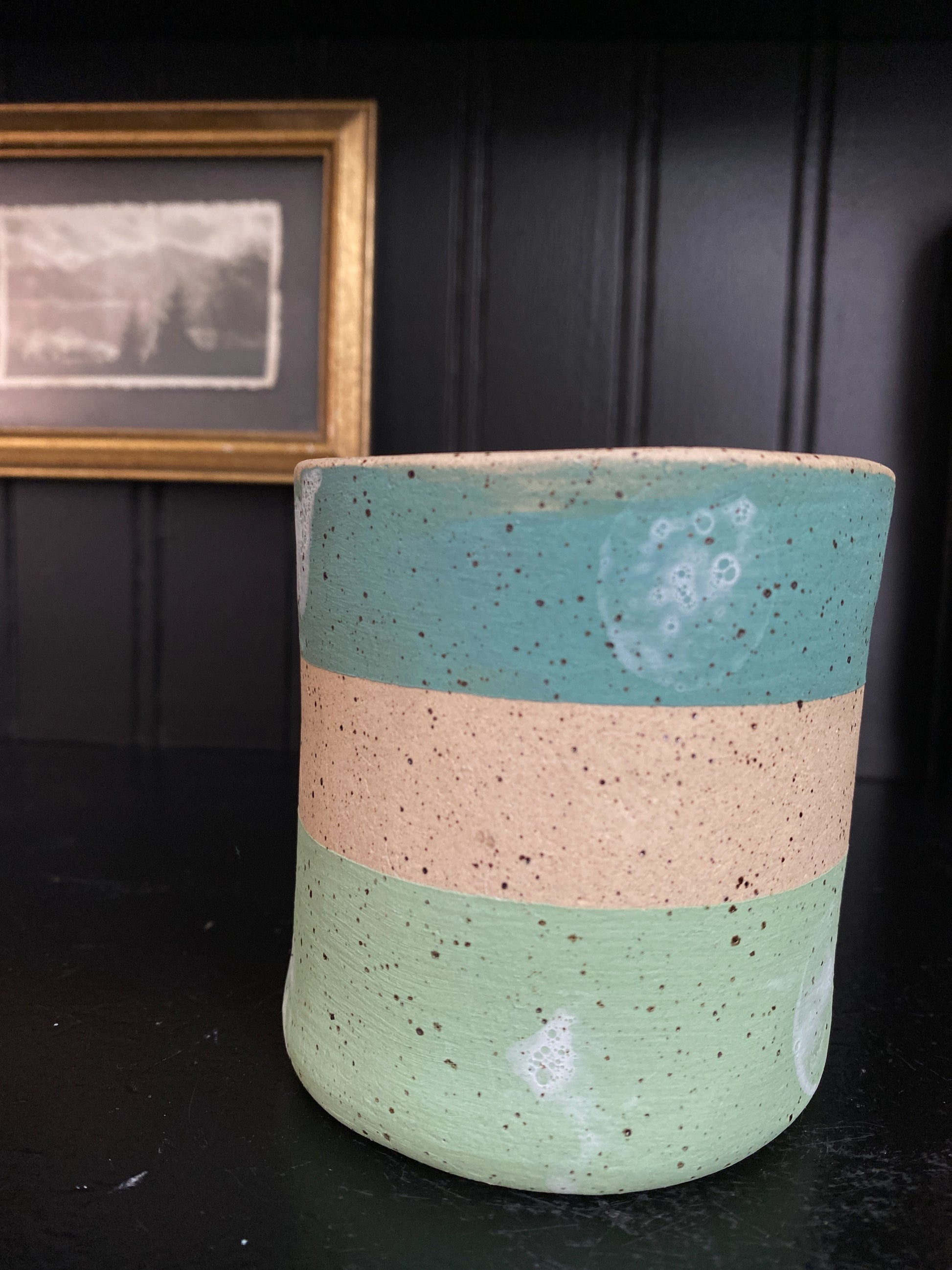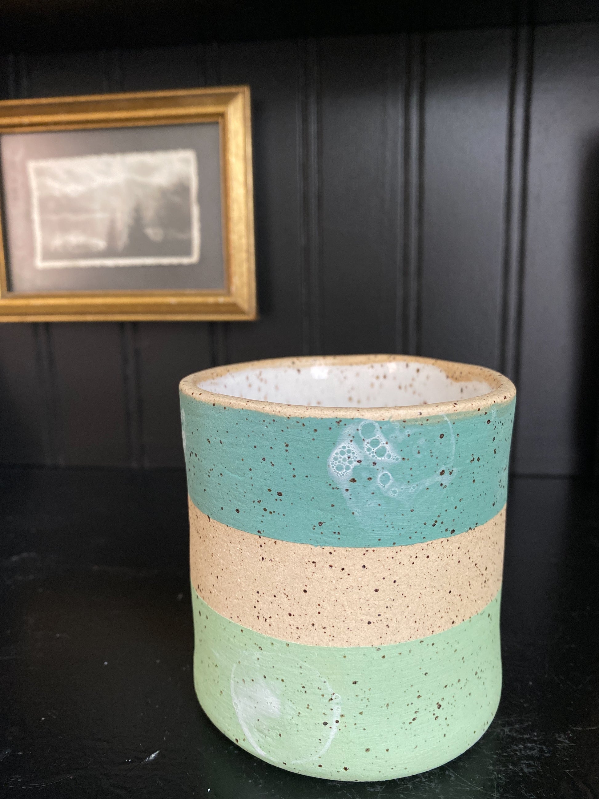 Hand Built 9oz ceramic tumbler. Food, Dishwasher and microwave safe. Intermixed raw clay body with underglazed/glazed exterior and a white glaze interior.