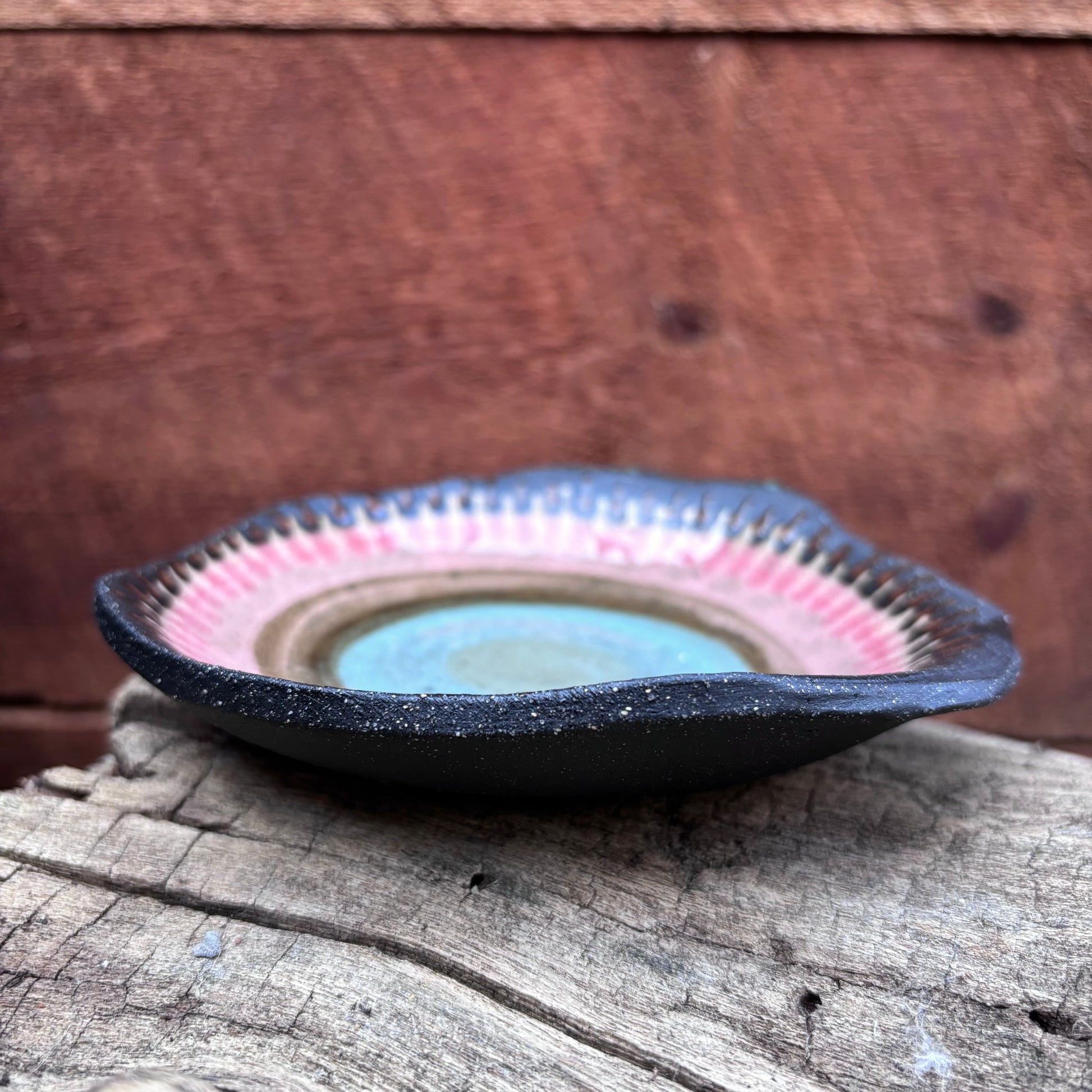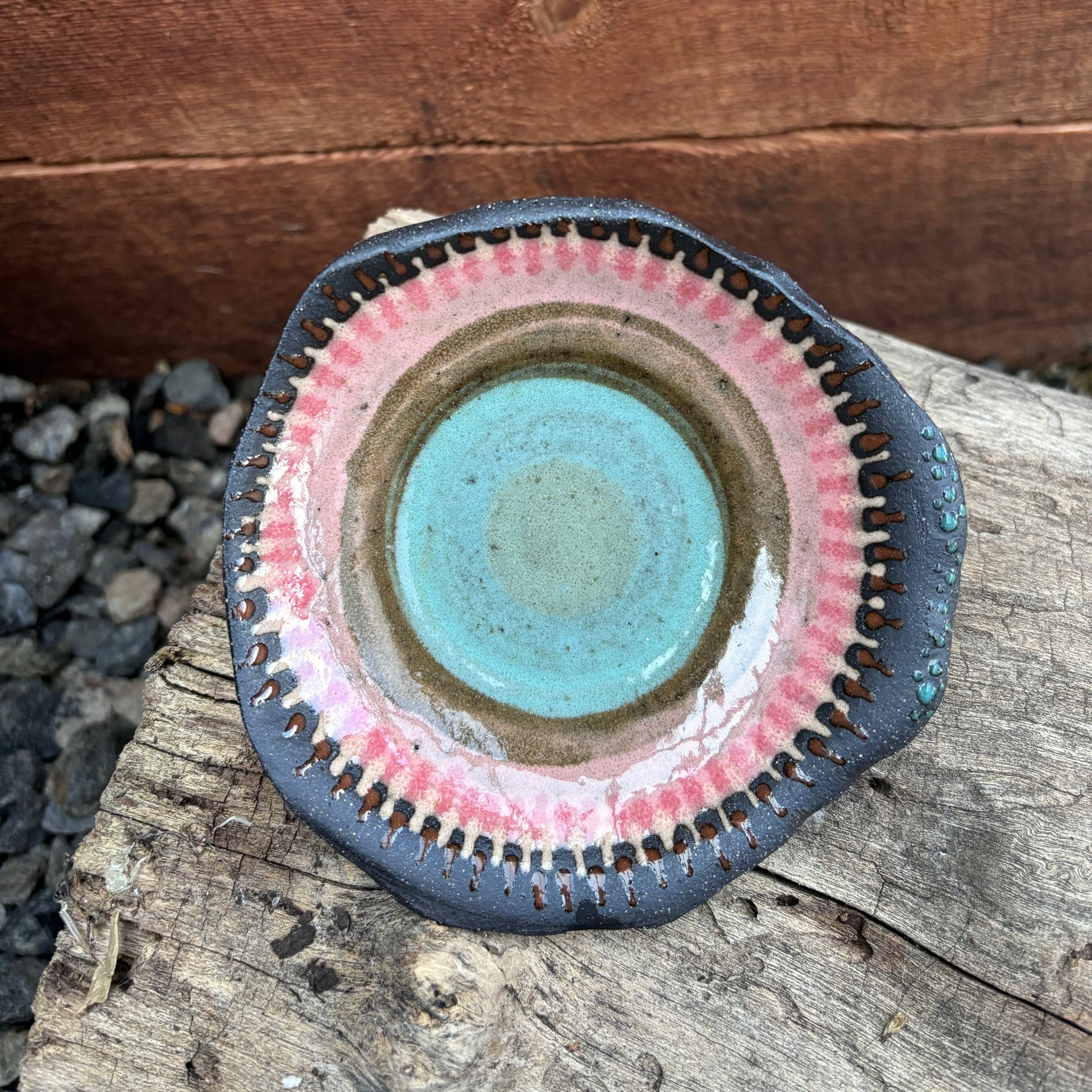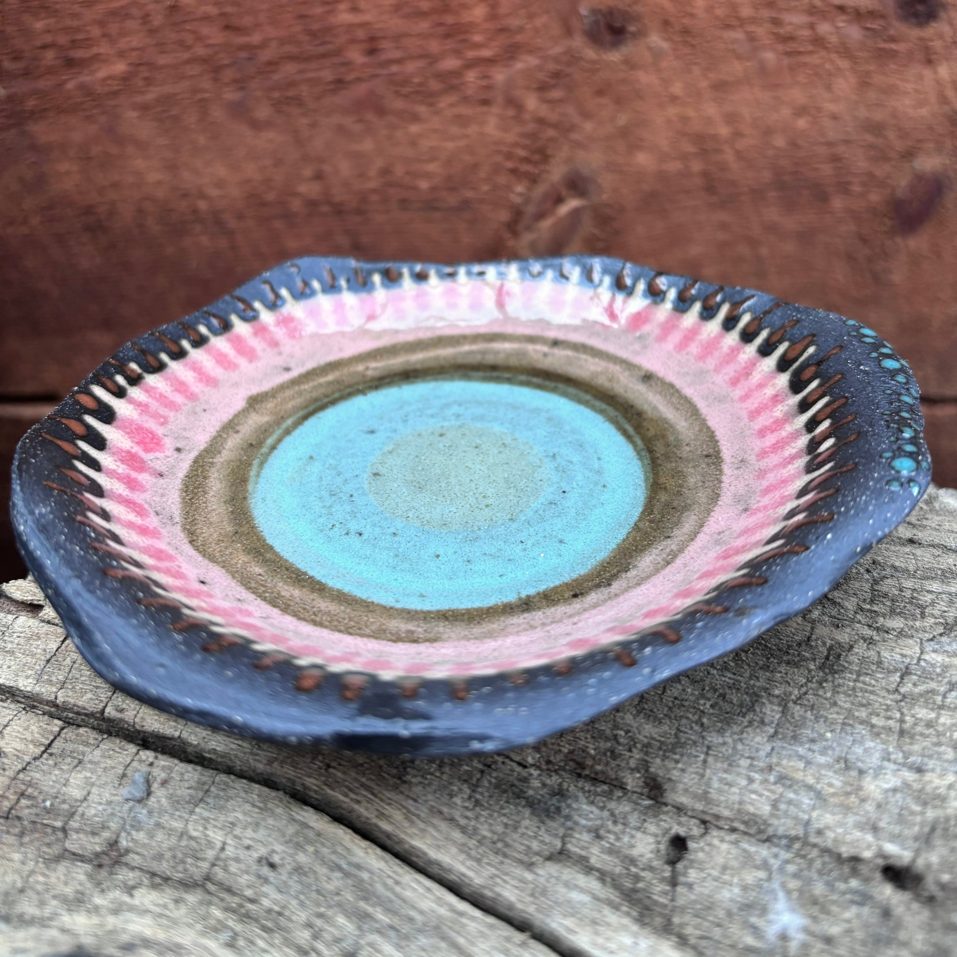 Hand built with an iron rich clay body. Food safe. Microwave and dishwasher safe. 5.5in Diameter