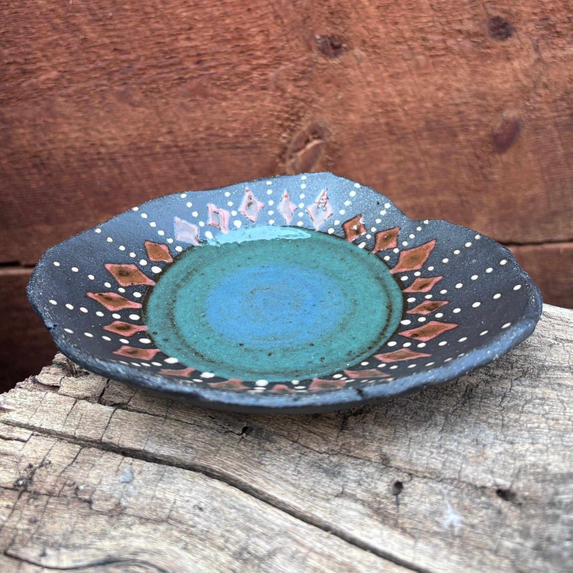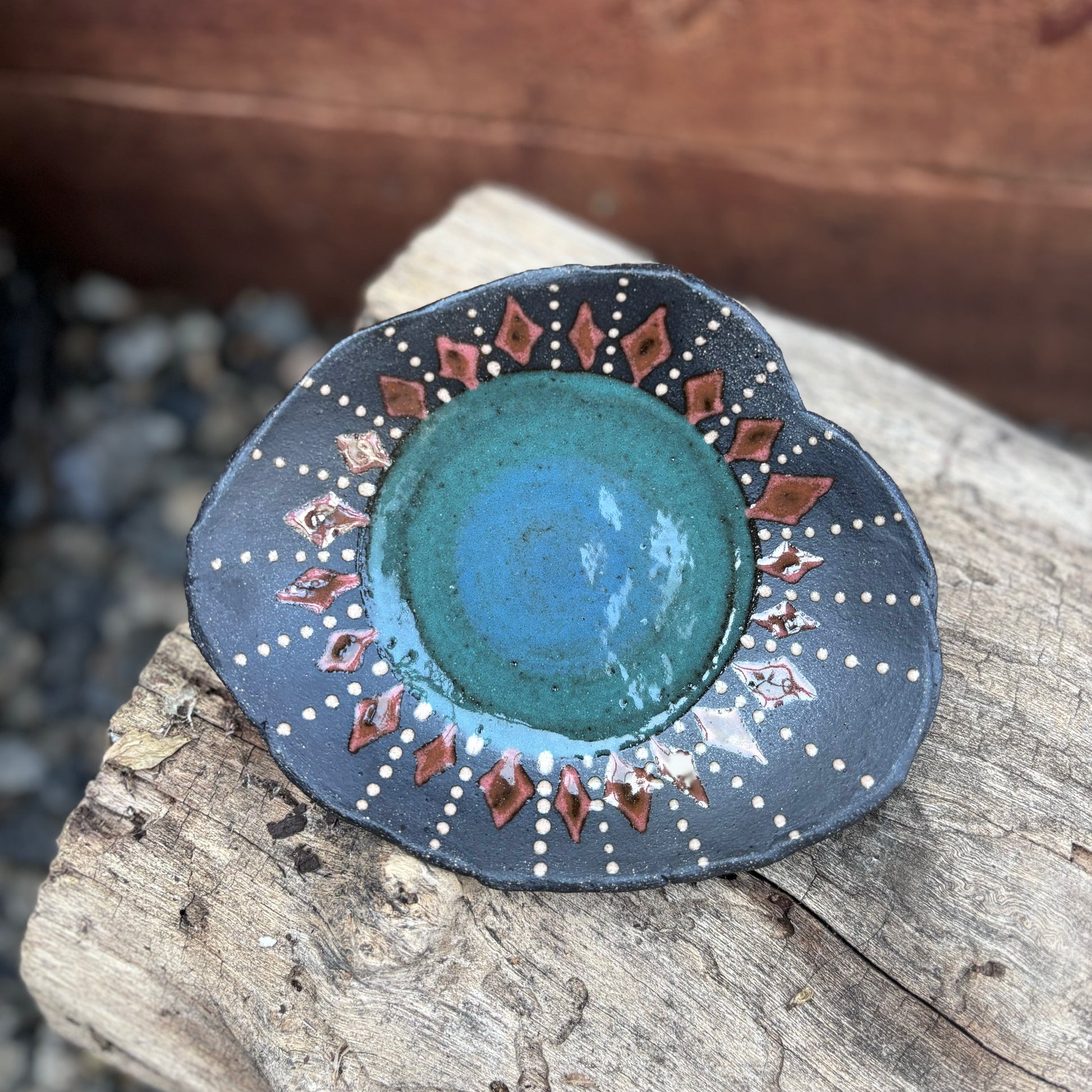 Hand built with an iron rich clay body. Food safe. Microwave and dishwasher safe. 6in Diameter