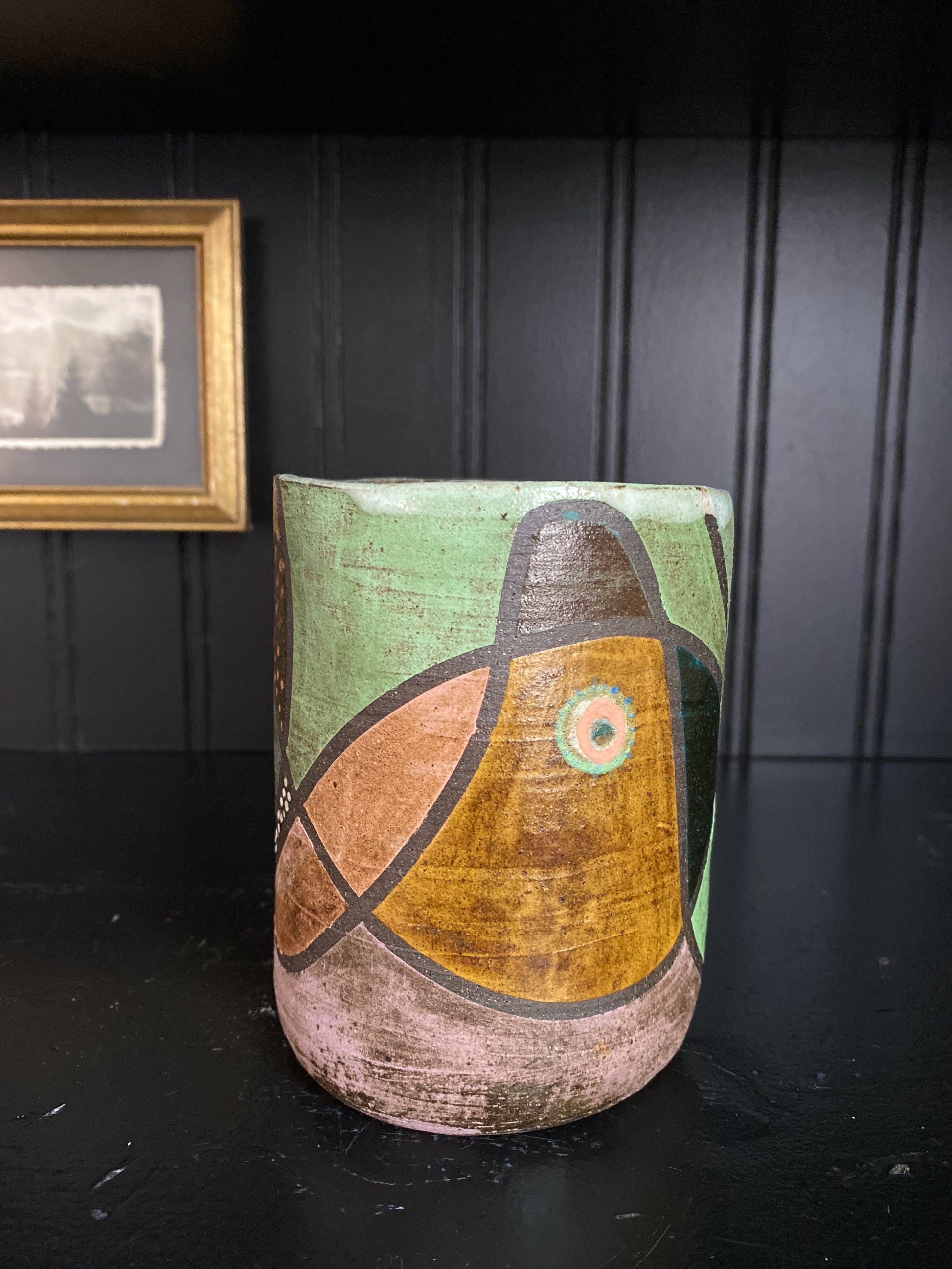 Hand Built 12oz ceramic mug. Food, Dishwasher and microwave safe. Intermixed raw clay body with underglazes/glazed exterior and a white glaze interior.
