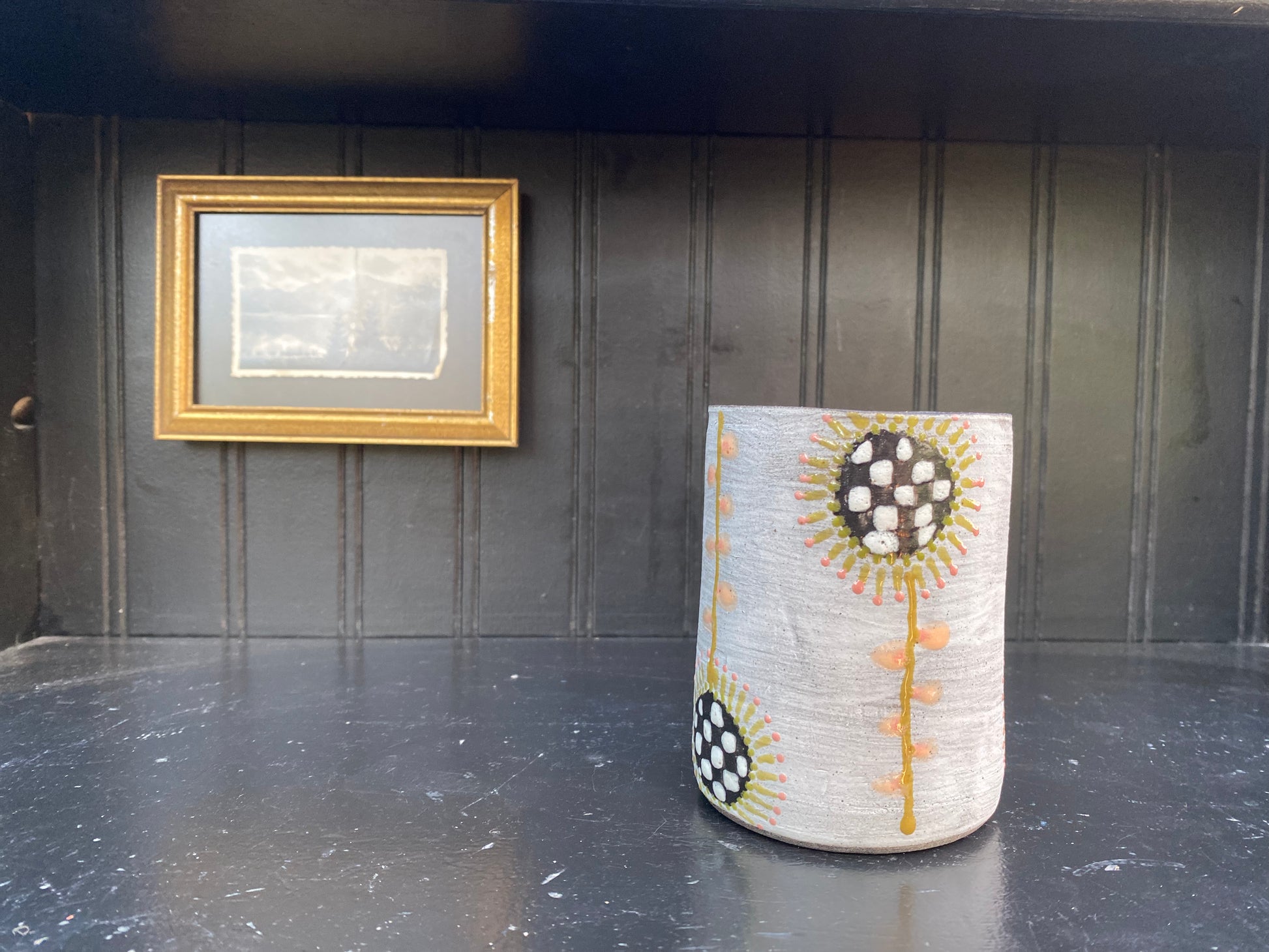 Hand built mug in an iron rich clay body with underglaze and glaze in interior and exterior. Microwave and dishwasher safe. 10oz