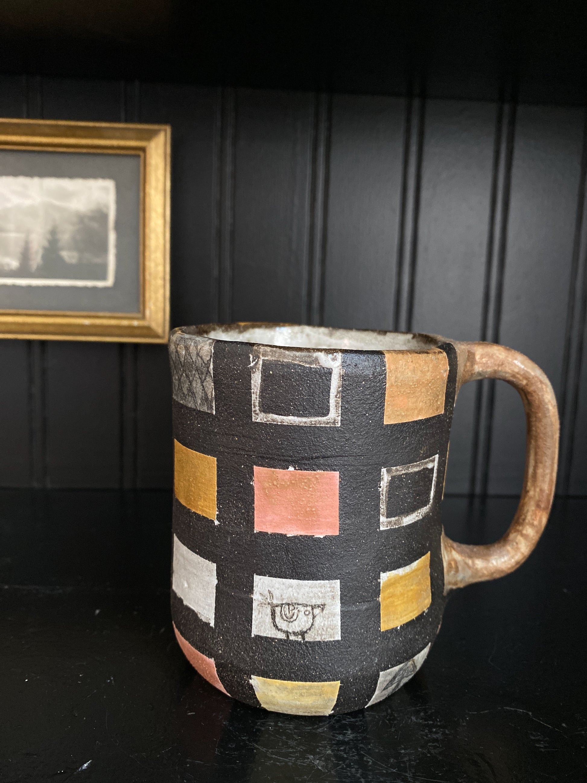 Hand Built 10oz ceramic mug. Food, Dishwasher and microwave safe. Intermixed raw clay body with underglazes/glazed exterior and a white glaze interior.
