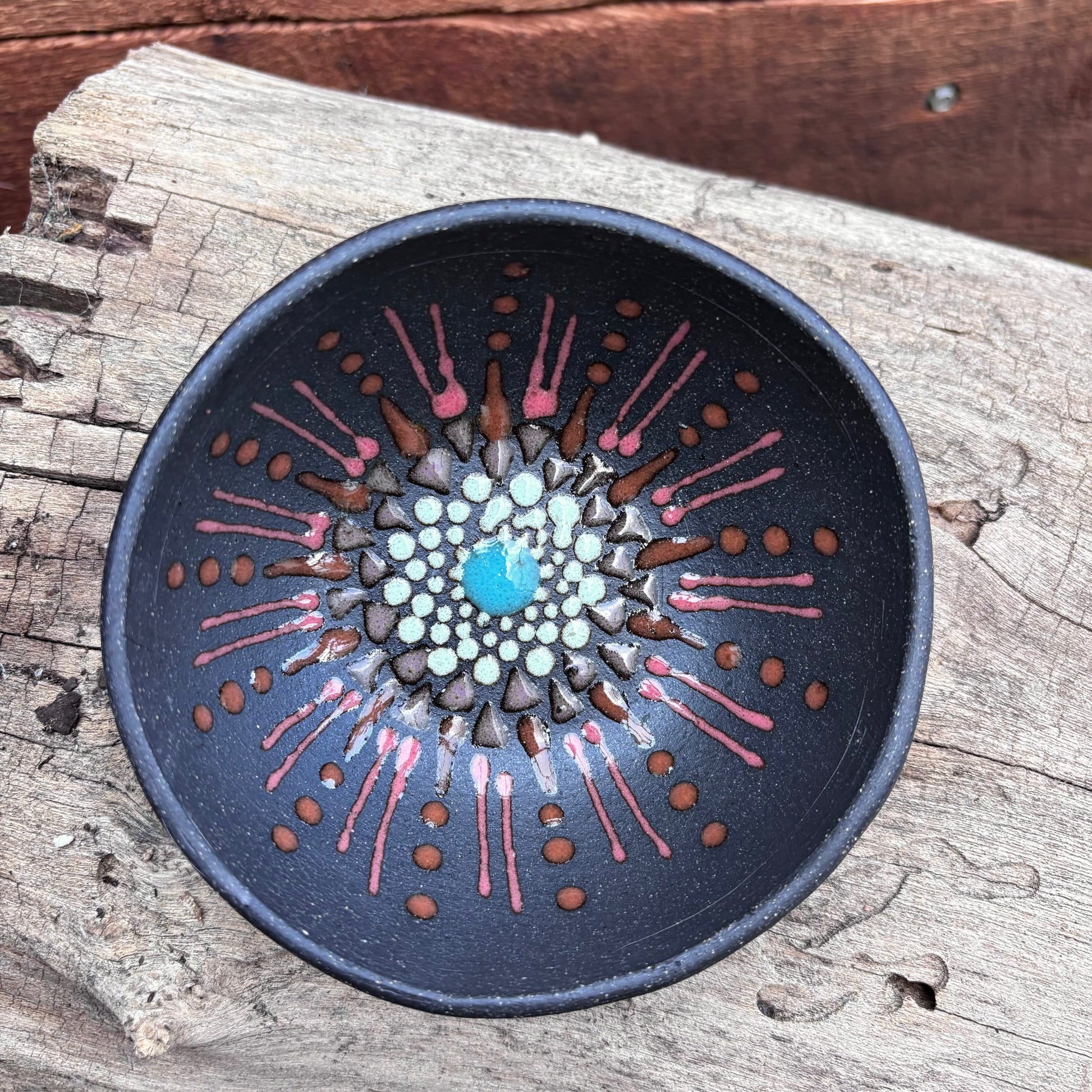 Hand built with an iron rich clay body. Food safe. Microwave and dishwasher safe. 5in Diameter, 1.75in height
