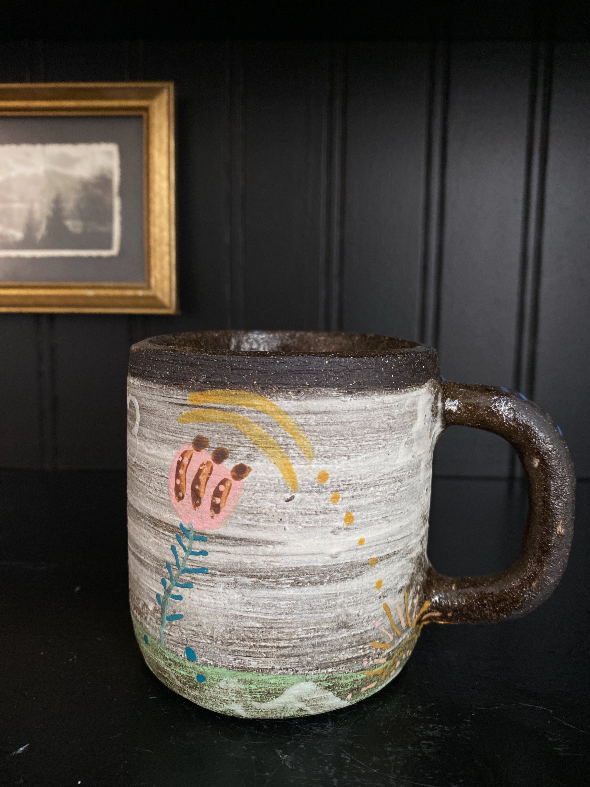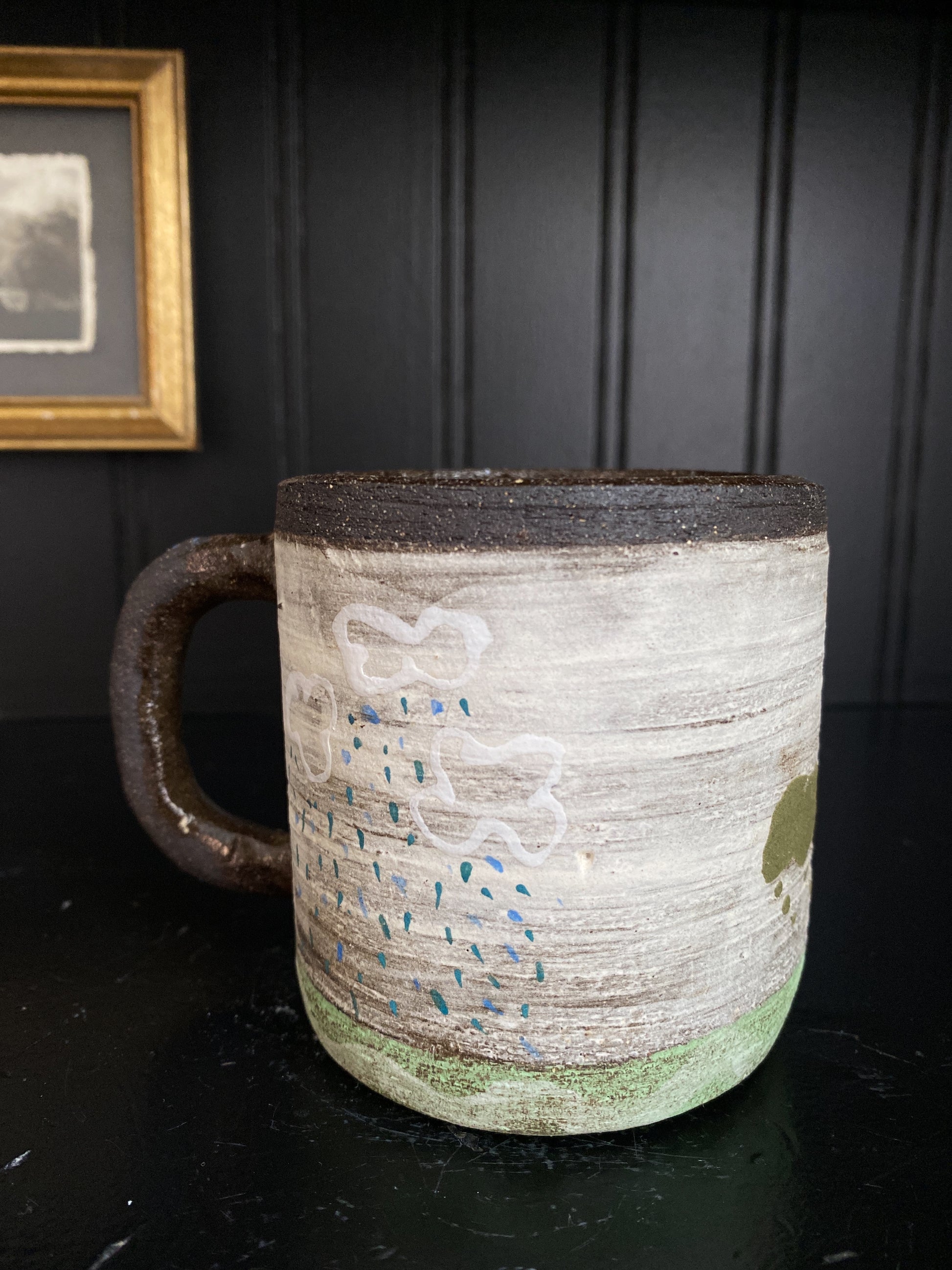 Hand Built 8oz ceramic mug. Food, Dishwasher and microwave safe. Intermixed raw clay body with underglazed/glazed exterior and a clear glaze interior.