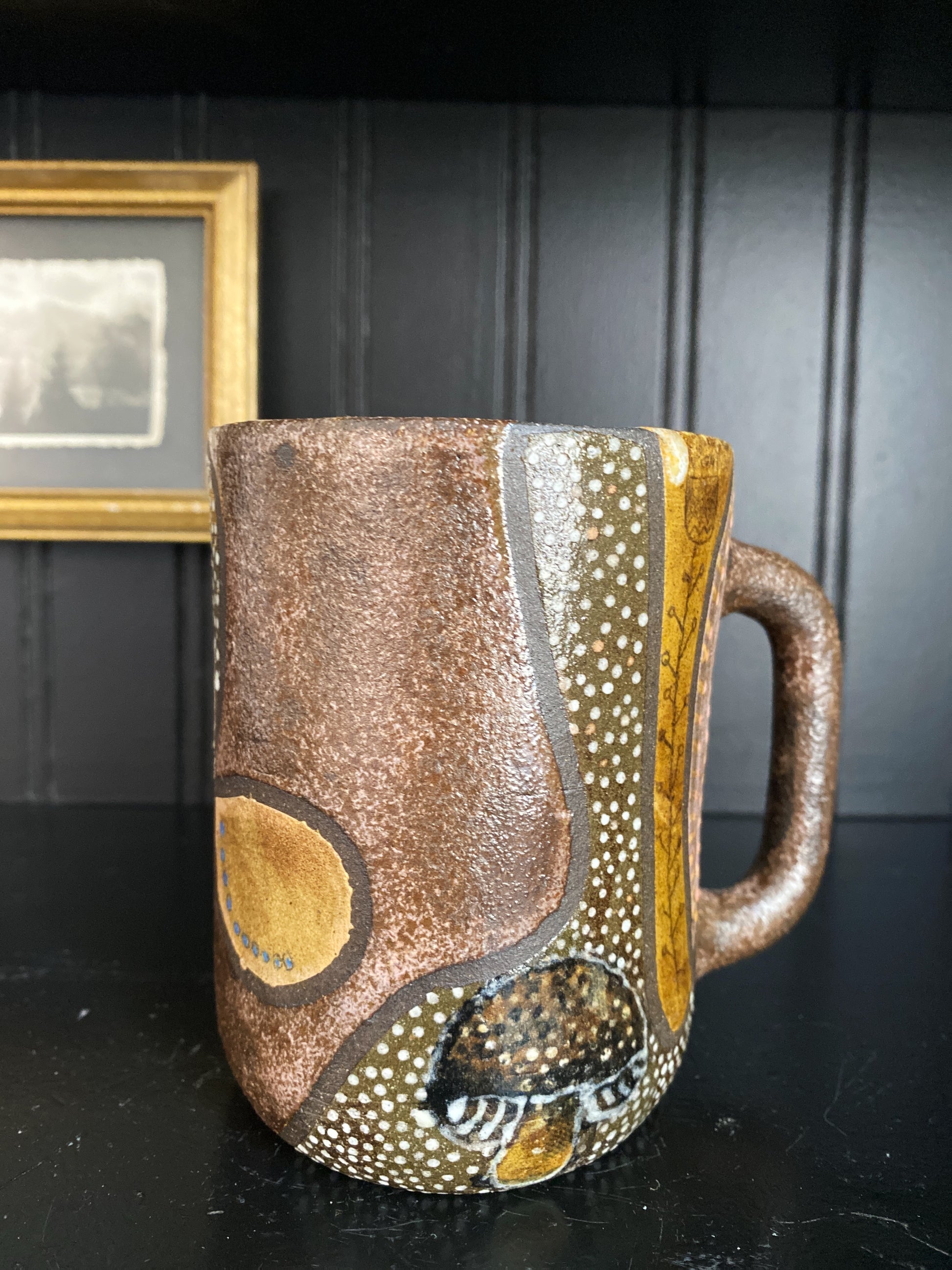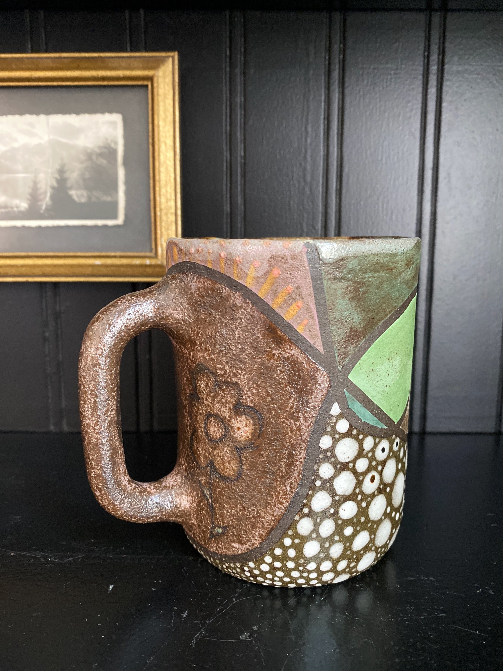 Hand Built 12oz ceramic mug. Food, Dishwasher and microwave safe. Intermixed raw clay body and underglazed/glazed exterior with a white glaze interior.