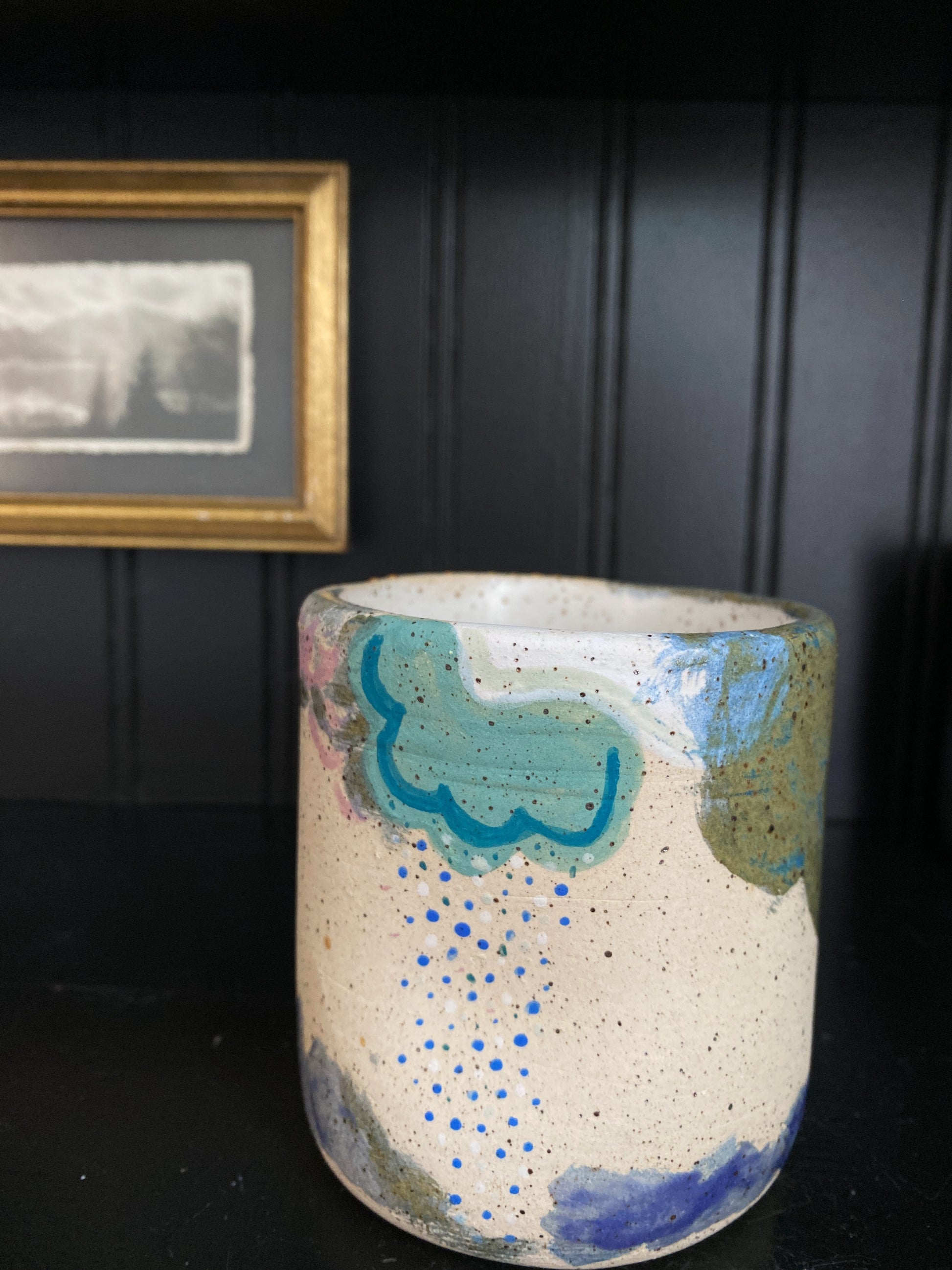 Hand Built 9oz ceramic tumbler. Food, Dishwasher and microwave safe. Intermixed raw clay body with underglazes/glazed exterior with a white glaze interior.
