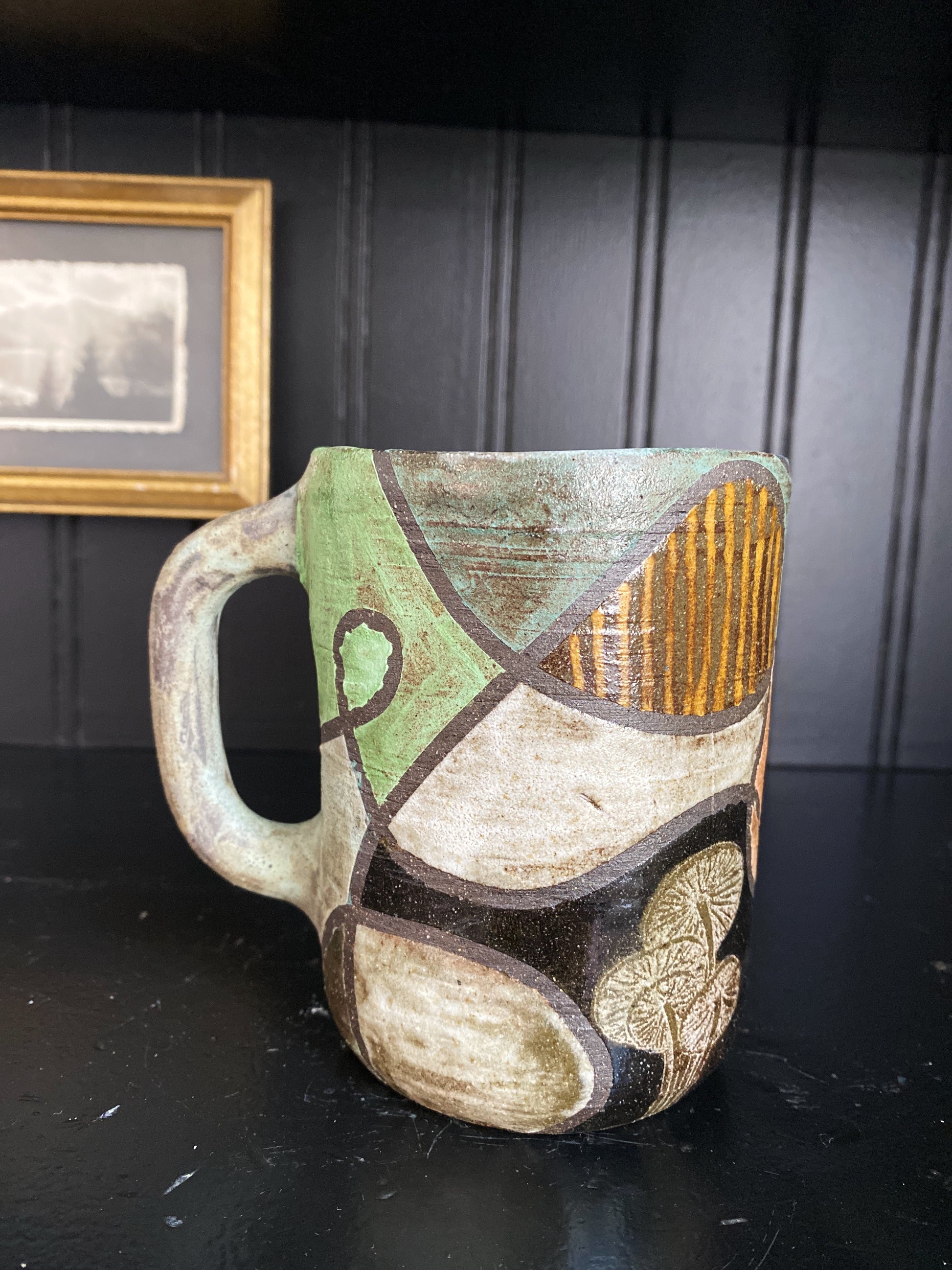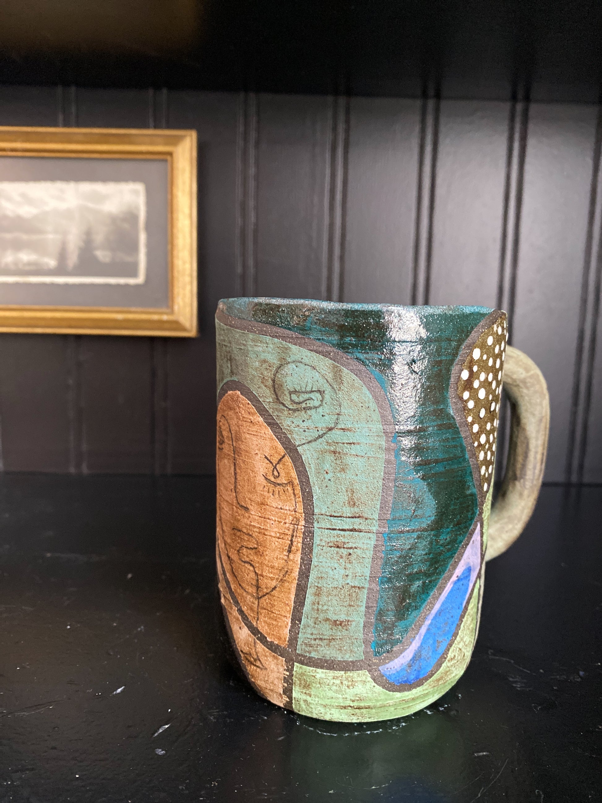 Hand Built 12oz ceramic mug. Food, Dishwasher and microwave safe. Intermixed raw clay body with underglazed/glazed exterior and a white glaze interior.